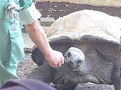 2016/01/03 リクガメ舎内でのアルダブラゾウガメ「ナンバーファイブ」の食事風景。信頼しきった表情で餌をくれるのを待っています。【写真上①】 2016/03/08 今年初めてリクガメ舎の扉が開けられました。早速、アルダブラゾウガメの「ナンバーファイブ」とケヅメリクガメが出てきました【写真上②】 ところが後から出てきたケヅメリクガメに気付いた「ナンバーファイブ」は、早速ちょっかいを出し始め、【写真上③】 「なんだなんだ」と向きを変えた気の強いケヅメリクガメと、いつも通りの睨み合いが始まり、【写真上④】 いつも通りスタッフに引き離されていました。 (島貫) 2016/03/17 「ナンバーファイブ」が外に出てきました。今年2回目です。 (島貫) 2016/03/21 春の動物園まつり 「ナンバーファイブ」は58歳だそうです。 (動物リレーガイド) |