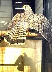 2024/06/13鳥インフルエンザ対策用シートが外され姿を見せたチョウゲンボウの「キビ」ちゃん。【写真左】 2024/07/13 換羽の時期で体調を崩したのか、最近、チョウゲンボウの「キビちゃん」は巣の上で休んでいます。 換羽のためか巣で休むチョウゲンボウの「キビちゃん」。【写真上③】 (平田) 2024/07/21 先日まで巣の上でだるそうに休む姿を見かけましたが、今日は止まり木に止まっており、目力がありました。 猛禽類らしい目力のチョウゲンボウの「キビちゃん」。【写真右】 (平田) 左 2024/08/04 暑さ対策なのか、新しい巣(台)が部屋の奥の廊下側に設置されていました。 奥に新設の巣の横で涼むチョウゲンボウの「きびちゃん」。【写真上④】 (平田) |