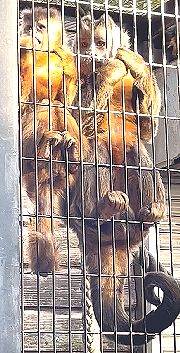 2024/08/04「マキオ」家の2頭の仔のうち、「マキオ」が正面に来るときに、よく一緒に来る仔がいます。 「マキオ」のことが大好きなようです。 フサオマキザルの「マキオ」(左)が大好きな仔(右)。【写真左】 (平田) 2024/08/18 マキオの仔が排水溝に入っていきました。が、つまらなかったのかすぐ出てきました。 排水溝に入るフサオマキザルのマキオの仔。【写真右手前】 入ってもおもしろくなかった・・・【写真右奥】 (平田) |
