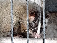 2012/02/11 今日は寒いためか、皆、ナイトルームの中でじっとしていたようです。そのうちの1頭が外の気配を感じたのか「何だろう」と顔を見せてくれました。【写真上①】 2012/02/26 左の一頭が給水器から水を飲もうとすると、右から一頭が寄ってきました。【写真上②】 左のほうが水を飲み始めると、右のほうが格子にしがみついていましたが、こちらには何があるのでしょう。 2012/04/15 4頭とも元気です。暖かくなってきたせいか活発に動くようになりました。今日は格子をよじ登っているのもいました。 2012/07/16 いつも4頭一緒なので、来園者には愛想なしのことが多いのですが、今日は嬉しそうな表情で1頭が近づいてきました。【写真上③】 2012/08/19 水を飲むハクビシン。暑い日は水を飲むのも順番待ちです。【写真上④】 暑い日は風通しの良いところで昼寝です。【写真左】 夜行性なので昼間は寝ていることが多く、起きているとのき動きもそれほど活発とは言えません。 2012/09/01 相変わらず日中は、昼寝、昼寝。檻の外から中を覗くと「何だろう?」眠そうな目で天井からこちらを眺めていました。【写真右】 地面の上では、やはり前後不覚に眠り込んでいましたが、こちらは近づいても起きる気配もありません。 2012/09/15 残暑厳しい中4頭とも元気です。 その寝姿は、2009年春、生まれてすぐに保護されたときと、ちっとも変わっていません。【写真左】 2012/10/21 ハクビシン4兄妹は元気です。 2012/11/03 相変わらず好奇心旺盛で、カメラを近づけるとすぐに寄ってきます。 2012/11/11 今日は全員いませんでした。えさ箱も空なので、健康診断か何かでバックヤードに行ったのかも知れません。 ![]() ![]() 2013/03/09 みんな高いところで寝ていましたが、尻尾が下がっていたのは3つでした。全部で4頭いたはずですが。 2013/03/24 春の動物園まつり ここにいるハクビシンたちの大好物はバナナだそうです。全員去勢済だそうです。バックヤードにはハクビシンの仔が1頭保護されていました。 (動物ガイドツアー、バックヤードツアー) 2013/05/12 ようやく暖かくなり4頭は活発に動いていました。 |