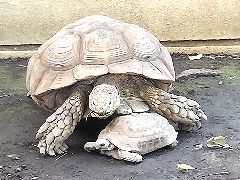ギリシャリクガメとヒョウモンガメのいる正面手前の区画に、今日は大きいホルスフィールドリクガメもいました。ヒョウモンガメは例によって、この区画から大きなアルダブラゾウガメのいるところに脱走しています。このヒョウモンガメを真似したのか、ホルスフィールドリクガメもこの区画の柵を乗り越えようとして失敗、ギリシャリクガメの脇に着地することになりました。【写真左】