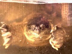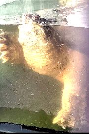 2023/02/18 首を伸ばした「ガメラ」の顔の先に、上下反転した顔が映っていました。「ガメラ」が上からも接近?いいえ、自分の顔です。【写真上①】 (平田) 2023/04/27 鼻を水から出し空気を吸う「ガメラ」。【写真上②】 その後、水中でのんびり。【写真上③】 2023/05/02 水面に顔を出し息を吸い込む「ガメラ」。【写真上④】 |