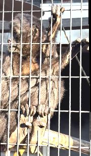 ![]() ![]() 顔なじみのお姉さんが「はい握手」と両手を出すと、照れながらそっと尻尾と手を出す「ダーリン」♂。尻尾は手足と同じように器用に動きます。図体が大きいので現在の獣舎ではちょっと窮屈なようです。【写真右手前】 ![]() 2005/02/26 冬の寒い日は、体を寄せ合ってじっとしています(左がオスの「ダーリン」、右がメスの「サマンサ」)。【写真右奥】 2005/09/23 樹上性のため親指は退化してありません。ここにいる2頭は動物園で生まれ、人工保育で育ったものです。 (夢見ヶ崎動物公園、宇田さん)。 ![]() 2006/03/26 春の動物園まつりで、ツアーガイドに新企画として、手と同じように機能する尻尾で、檻の外の切株から餌を採る様子を見せ説明。 2006/03/31 3月28日付で公式HPを更新、新しい企画として、春の動物園まつりで評判の良かった、檻の外の切株の上の餌を尻尾を使って上手に取る様子がいつも見れるようになりました。 ![]() ![]() 2007/01/18 オスのほうが風邪を引いて治療を受けています。 メスが隣のフサオマキザルに薬指を咬まれ手指を骨折、ブラブラになったため、オス、メスとも外に出さず、ナイトルームで静養しています。【写真右】 2007/02/14 手指骨折のメスは開放性の脱臼でした。麻酔をかけ整復・縫合しました。しばらくは赤い包帯姿になります。 2007/02/22 右手薬指開放性脱臼のメスは、間接部分から先が壊死したため、麻酔のうえ骨切除・縫合の手術を行いました。 2007/02/27 手術したメスの包帯を取りました。あとは自然治癒を待ちます。 2007/03/21 春の動物園まつり「園内リレーガイド」では宇田さんによる恒例の尻尾で餌を受け取る実演が来園した子供達も参加して行われました。尻尾の説明では、その話になると檻のなかから尻尾をひょいと出すなど、宇田さんとクモザルは何でも通じ合うようです。【写真左】 2007/07/02 7月30日は、東京農工大の環境エンリッチメント実験第2弾「フィーダー(エサやり器)」に関するもののお試しを行いました。バナナを1本皮付きでまるのままクモザル、オマキザル、リスザルにあげてみました。クモザルは手を使い、オマキとリスは手と口を使いそれぞれに皮をむいてから実を食べてました。でも結局皮も食べちゃったようなんですが・・・(ちなみにニホンザルは皮のまま囓り、皮をはき出したとのことです。)やはりオマキの方がワンランク上か? そしてドイツ製のダルマ落としのようなフィーダーと竹筒も使います。 (ブログ「動物園からの手紙」) 2007/09/08 機嫌の良いときは、オスだけですが、後ろ向きになり尻尾を檻の外に出して触らせてくれます。そして相手を気に入ると尻尾を握ったときちゃんと握り返してくれます。隣のフサオマキザル同様、随分お利口です。 2007/10/20 尻尾で握手する相手は、クモ♂の独断と偏見による好みで決まるようで、誰とも握手するわけではありません。顔見知りで動物好きな女性との握手が多いようです。 ![]() ![]() 2008/04/05 三寒四温の季節を迎え、夜の冷え込みでクモザル♂が体調を崩しましたが、少しずつ食欲が戻ってきているそうです。 2008/04/09 毎日尻尾と握手しに来る熱心なフアンも多いオスですが、最近の寒さ続きで体調はなかなか元に戻ってくれないようです。 2008/04/19 今日の夕方は、クモザル舎が閉じられていました。♂♀ともに体調を崩したのでしょうか。 2008/04/27 2頭とも退院、クモザル舎に戻りました。♂のほうは、いつもの元気さはまだないようです。 2008/04/29 オスはまだ体調が完全に回復していないようで、外にいるときは寝ていたり、日中でも暖房のところにいたりしています。 2008/06/17 メスが人に興味を示すようになり、檻のなかから尻尾を差し出し握手に応じるようになりました。 2008/10/26 クモザル舎の前にカメラが置かれ、調査が始まりました。去年の環境エンリッチメント実験の続きが始まったのでしょうか。 2008/12/19 いつも愛想良く尻尾を出し挨拶してくれたクモが、最近、顔見知りが来ても知らん顔をしています。人間不信になるようなことをした来園者がいたとすれば、動物と人が他の動物園より密接にコンタクトできる夢見らしさが失われることになり、大変悲しいことです。 ![]() ![]() 2009/01/01 ナイトルーム奥の赤外線ストーブで暖をとっていましたが声を掛けると、こちらを見て、わざわざ表まで出てきて尻尾で握手してくれました。そして握手が終わるとサッサと奥へ引き上げました。しばらく人間不信が続いていましたが少し回復してきたようです。 2009/01/31 「クモザル舎」のナイトルームのシャッターが閉じたままです。呼ぶと茶色いほうが上下に開くシャッターを自分で開けて出てきました。それからは、思いっきりシャッターを開けたり閉めたりの遊びが始まり、シャッターに合わせ跳んだりはねたり大騒ぎです。よく動くシャッターで、開閉のたびにガシャンガシャンと大きな音が出ますが、そのうち壊れそうな気配です。隣のフサオマキザルはこれを見物しているものの、クモ