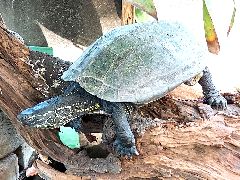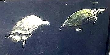 冬眠中のクサガメ。座ったもの、立ったままのもの、斜めに寄りかかったもの、みんな思い思いの恰好で、眠るというより無呼吸の仮死状態でひたすら動けるようになる水温の上昇を待っています。【写真左】 2018/03/03 冬眠からの目覚め 温かくなり冬眠から目覚めたクサガメと、【写真上①の左】 ミシシッピアカミミガメ。 2018/03/10 先週より寒いためみんな水底に戻っていました。 2018/03/18 今日は水中にいるもの、日向ぼっこするものと色々でした。【写真上②】 2018/04/21 全員冬眠から覚めたようで、沢山のクサガメが日光浴していました。【写真上③】 毎年9月中旬にクサガメが、10月初めにイシガメが水中で冬眠に入ります。水のなかでは肺呼吸ではなく腸呼吸でいのちをつないでいます。 バランスをとるためか左手を伸ばし体を支えるイシガメ。重なってじっとしていますが疲れないのでしょうか。【写真左奥】 2018/06/30 夏の直射日光を浴び気持ちよさそうに日光浴するクサガメ。【写真左】 2018/07/14 鼻を水面に出し気持ちよさそうに泳ぐクサガメ。【写真上④】 201/07/27 野外水槽水面下を泳ぐクサガメ。【写真右】 |
