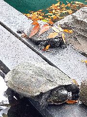 2015/10/03 イシガメとクサガメは相変わらず不安定な恰好で重なり合っています。【写真上①】 それが5 分後には誰か動いたらしく〝荷崩れ〟を起こし、不安定な恰好のままじっとしていました。【写真上➁】 2015/10/13 石の上で日光を浴び、思いっきり手足を伸ばし昼寝するクサガメ。【写真上③】 2015/10/31 冬を思わせる寒さです。野外水槽でいままで甲羅干しをしていたカメの姿がありません。みんな水に潜ったままのようです。水底を覗くと、1頭が冬眠の準備に入るかのように、ゆっくりゆっくりと動いているのが見えました。【写真上④】 2015/11/03 久しぶりに暖かくなり、水底にいたクサガメ、ミシシッピアカミミガメが水から出て、気持ち良さそうに甲羅干ししていました。 |