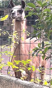 2015/07/02 水飲みは以前からあった大きなヘラジカ用を利用しています。【写真上①】 (島貫) 2015/07/07 餌場は専用のものを作ってもらっています。【写真上②】 (島貫) 2015/07/15 飼育スタッフにケアされ、甘える「タイタン」。あんまり見ていたら、「お客さん、 じろじろ見すぎですよ」と「タイタン」(^_^)ゞ(汗)。【写真上➂】 信頼するスタッフに甘える「タイタン」の微笑ましい一面を観察できたような気がします。 (島貫) 2015/08/08 ラマの「ナン」♀。「タイタン」♂と同時に夢見に入園したのが去年の11月。ここ加瀬山の自然林に囲まれた環境にも慣れたようです。【写真上④】 |