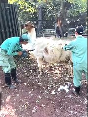 2015/04/16 スタッフによる「タイタン」と「ナン」を家畜として馴らすための餌やり風景です。【写真上①と上②】 (島貫) 2015/05/04 ラマのトレーニング中です。 ラマのタイタンとナンがやってきておよそ半年が経ちました。お披露目の日に突然交尾を始めるなど、なにかと話題になりがちでしたが、最近ではしばしば職員がラマと触れ合う姿が見られると思います。 これは、体を触らせる代わりにおやつのペレットが食べられる、という学習付けを行い、人に触られることに慣れてもらうためのトレーニングをしているところです。上手くトレーニングが成功すれば、彼らの行動の観察がしやすくなる他、処置や診療のストレスが少なくなります。また、家畜と野生種の違いはありますが、他の動物種にも応用できる部分もあります。 決してやみくもにおやつをあげたり、べたべた触ったりしているわけではありませんので、どうか担当職員の奮闘とラマたちの反応を楽しみながら見守っていただければと思います。 (ゆめみにゅーす VOL 36) 2015/06/09 閉園時のラマ舎。「ナン」が室内に導こうとするスタッフに唾を吐きかけていました。【写真上③】 (島貫) 2015/06/22 アルダブラゾウガメの「ナンバーファイブ」への餌やりを隣からじっと見つめるラマの「タイタン」と「ナン」。【写真上④】 (島貫) |