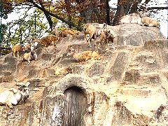 2023/03/24 川崎市政ニュース映画(かつて映画館で上映されていたもの)「野生ヤギの王様マーコール -川崎市立夢見ヶ崎動物公園-【昭和58年(1983年)1月15日】(映像)」 マーコールが初めて夢見に来たときの貴重な映像。【写真上④】(川崎市映像アーカイブ) 2023/03/25 雨の中、マーコールのオスが手前に1匹、奥に身を寄せる3匹がいました。翌日も雨でしたが、同じ構図でした。【写真左: 雨の中のマーコールのオス達】(平田) 2023/03/27 春うらら、口に何かくわえ岩山の中腹で満足そうに寝転がるマーコール。【写真右】 |