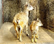 5/12 に生まれた2頭は、翌日が雨にもかかわらず無事に育っていました。母親からお乳を貰い、2頭連れだって急な岩場を平気で登り、平地にいるときは子ヤギ特有のピョンピョン飛び跳ねる仕草も見せています。でも高い岩場から下へ降りるときは、まだおっかなびっくりのようです。 無事に生後3日目を迎えた2頭の仔とその母親。【写真上左】 母から離れ2頭一緒に岩のぼりを始めました。【写真上中】 でもすぐお腹がすいて一頭は母のもとへ。【写真上右】 お乳を飲んでいる間、もう1頭は自分の母を探し始めました。【写真左】 母は平地にいました。どうやって降りようか?こわごわ下を覗く赤ちゃん。【写真右】 |