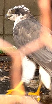 2024/09/17 オオタカが水の入った丸い桶の中に入っていました。両脚を水につけたままほとんど動いていません。連日の暑さにクールダウンが必要だったのでしょう。約8分後に見に行っても脚がつかったままでした。 手前に抜けた羽が落ちていました。暑さの中、換羽も重なり、しんどい状態かもしれません。 水に脚をずっとつけていたオオタカ。【写真上①】 (平田) 2024/09/24 水の入った丸い桶は相変わらず下に置かれていました。今日は涼しかったためかオオタカは木の上、いつもの定位置でした。 2024/10/25 鳥インフルエンザ対策のためキジクジャク舎、オウムインコ舎、猛禽類舎(鳥獣舎の一部)は透明なアクリル板で外と遮断されました。 2024/10/26 「ニシトビ」、「チョウゲンボウ」、「オオタカ」(猛禽類トリオ)の部屋、オウムインコ舎、キジ舎に鳥インフルエンザ対策のアクリル板やシートが貼られていました。猛禽類トリオの部屋は昨年と異なりシートではなくアクリル板でした。【写真上②】 (平田) 2024/11/14 水の入った丸い桶の縁でたたずむ「オオタカ」。【写真上③】 (平田)