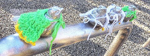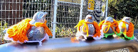 2012/04/28 & 04/29 ここには3つの車止めに上に、それぞれ4羽のピコリーノがいます。今回は、3つの車止めごとに違う色、青、赤、紫の服を着たピコリーノが並びました。【写真上①②③】 2012/05/12 新緑の季節の合わせ、ピコリーノたちは周りの木々に溶け込むかのように鮮やかな緑の衣装に変わっていました。【写真上④】 |