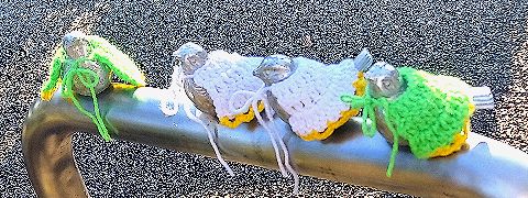2023/01/21 ピコリーノ。いままでの衣装に新しいものが加わりました。【写真上左と上中】 2023/02/04 毎週着るものが増えるピコリーノたち。【写真上右: 全体】 【写真左: 3羽と向き合う1羽】と、 【写真右3枚: それぞれ違う姿で並ぶ3羽】 |